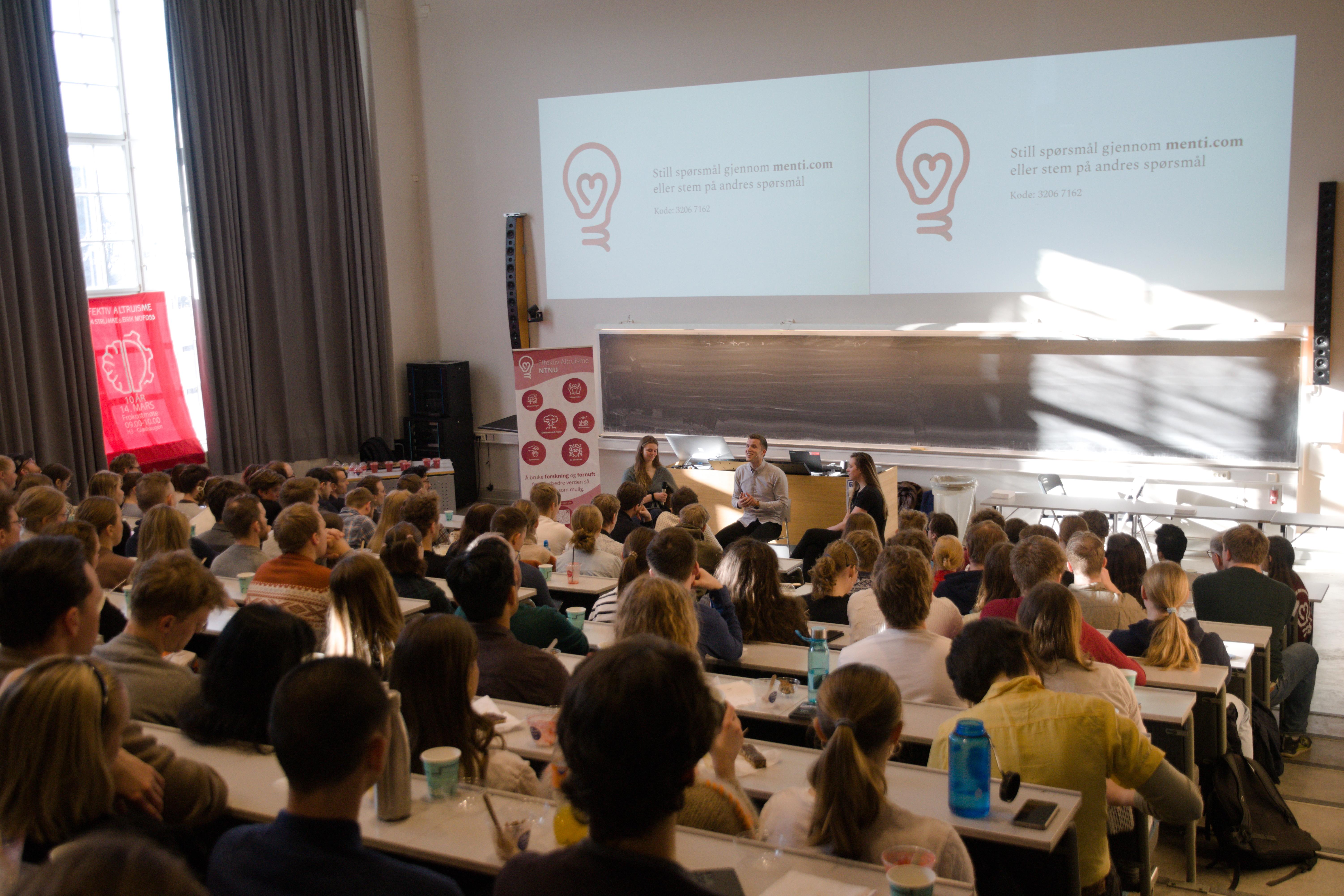 Et verv i Effektiv Altruisme NTNU innebærer prosjektarbeid, diskusjonsmøter og sosiale arrangementer, og vervet er åpent for alle studenter i Trondheim. Aktivitene har både formål om å utvikle oss som medlemmer og å spre ideer på campus om å bruke våre ressurser på å gjøre godt i verden. Avbildet er et prosjekt fra våren 2024 som arrangerte en samtale med Inga Stümke og Eirik Mofoss i anledning vårt 10-årsjubileum.